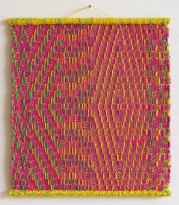 Series of smaller weaves in which I try to find visual patterns with minimal color combinations. The basis of these fabrics is derived from Ocular Aurora but with more variation in the patterns and colors. This ongoing research is also a challenge to present my works in series, always returning to my own imaginary glitches as a trans woman.